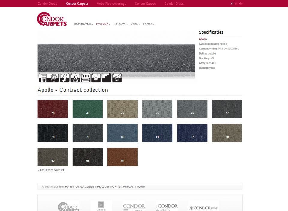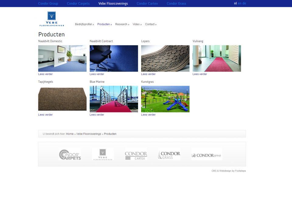 Voor Condor Group, en voor de onderliggende bedrijven, heeft Footsteps nieuwe websites ontwikkeld. Het resultaat is een strak ontwerp met aandacht voor de producten. Naast het ontwerp leverde Footsteps ook het content management systeem om de nieuwe website eenvoudig te beheren. Een belangrijk element is dat elk bedrijf een eigen look and feel zou krijgen en tegelijkertijd een eenheid moet uitstralen. Door het gebruik van een vast stramien met elk eigen huisstijlkleuren is deze doelstelling behaald. Aan de hand van afbeeldingen en video's kan de bezoeker snel een indruk krijgen van de producten die Condor maakt. De detailpagina’s worden ondersteund door close-up-beelden. Op deze website zie je dat de presentatie van producten een belangrijk element is.